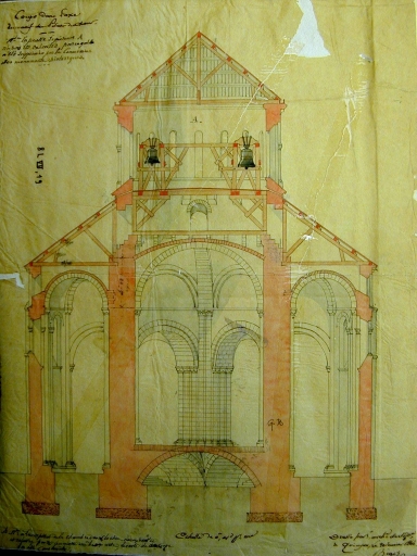 Coupe dans l'axe du massif des piliers du choeur et chambre des cloches. Partie A : non réalisée. Dessin Gustave Bigot, vers 1864-1866 (A.E. Quimper, Fonds Bigot)Immatriculation