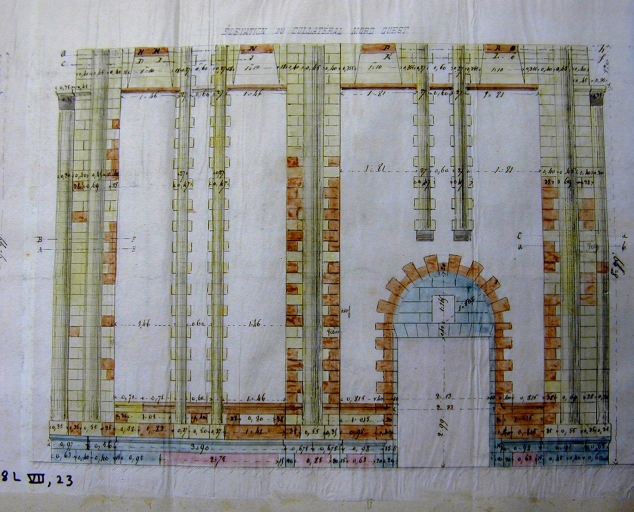 Elévation du collatéral nord ouest en cours de restauration. En violet : pierres provenant de la démolition. Dessin Gustave Bigot, vers 1864-1866 (A.E. Quimper, Fonds Bigot)Immatriculation