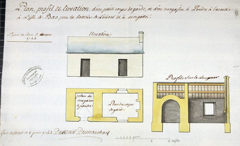Projet pour l'Île-de-Batz : plan, profil et élévation d'un petit corps de garde et d'un magasin à poudre à faire près de la batterie de l'Ouest et à Morgat, fait à Brest le 8 juin 1744 par Dubreuil DumarchaisImmatriculation