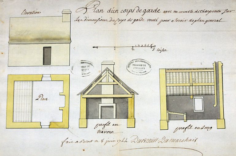 Elévation, plan et profil d'un corps de garde avec comble de charpente sur les dimensions du corps de garde voûté pour servir de plan général, fait à Brest le 8 juin 1744 par Dubreuil DumarchaisImmatriculation