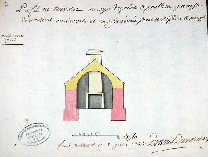 Profil en travers du corps de garde de Poulhan, paroisse de Plouzevet (Plozevet : Finistère Sud) où la voûte et la cheminée sont à refaire à neuf, fait à Brest le 8 juin 1744 par Dubreuil DumarchaisImmatriculation