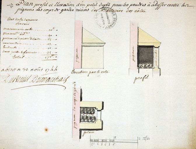 Elévation, plan et profil d'un petit dépôt pour les poudres adossé contre les pignons des corps de garde voisins des batteries de côtes, fait à Brest le 31 août 1744 par Dubreuil DumarchaisImmatriculation