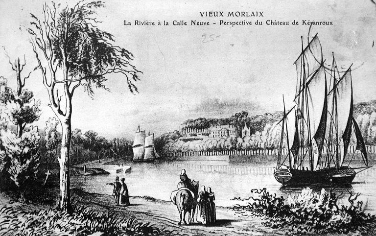 Dessin représentant le vieux Morlaix : la rivière au lieu-dit la cale Neuve - Perspective du château de Keranroux, carte postale ancienne, Bibliothèque Municipale de MorlaixImmatriculation