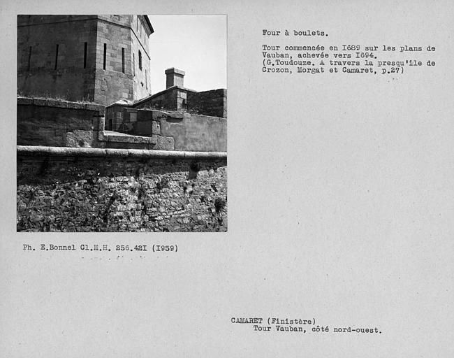 Vue de la tour Vauban, façade Nord-ouest (on aperçoit la cheminée du four à boulets), 1959Immatriculation