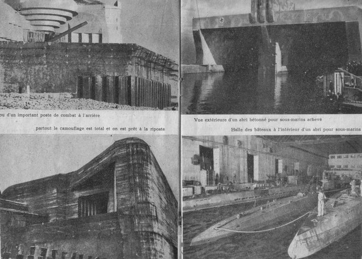 Extrait de l'ouvrage de propagande nazie intitulé "Laissez les tranquillement venir" : quatrième double page [troisième photographie montrant la base de sous-marins du Scorff à Lanester, 1941]Immatriculation