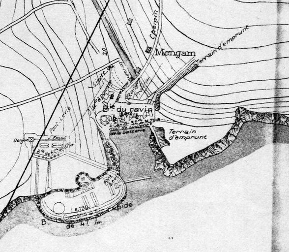 Détail du plan de situation des batteries du Mengant (batterie du fort : canons à tir rapide de 47 mm, batterie basse du ravin : 4 canons de 32 cm), Atlas des batteries de côte : côte de Brest, 1893, VincennesImmatriculation