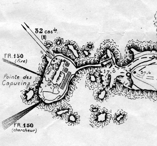Détail du plan de situation des batteries des Capucins : ilôt des Capucins (batterie casematée de 32 cm, FR 150 mm fixe, FR 150 mm chercheur), Atlas des batteries de côte : côte de Brest, 1913, VincennesImmatriculation