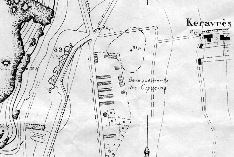 Détail du plan de situation des batteries des Capucins : batterie de 32 cm, baraquements, Atlas des batteries de côte : côte de Brest, 1913, VincennesImmatriculation