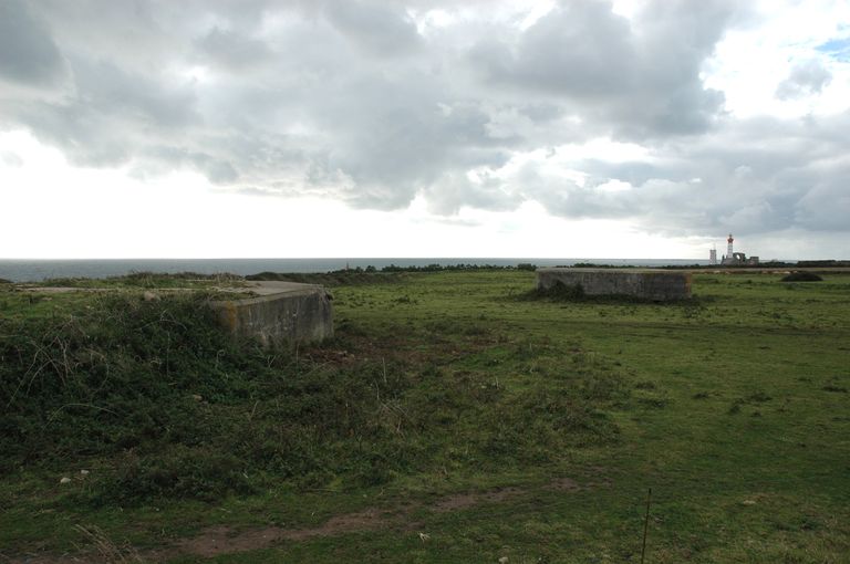 Vue générale vers l'ouest. Au premier plan à gauche, l'un des trois bunkers - encuvements de type Fl 243a. En arrière-plan : la Pointe Saint-Mathieu dominée par son triptyque abbaye, phare et sémaphoreImmatriculation
