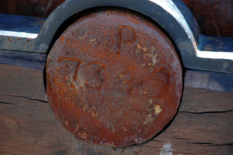 Vue de la pièce d'artillerie : détail du tourillon gauche (état en 2004)Immatriculation