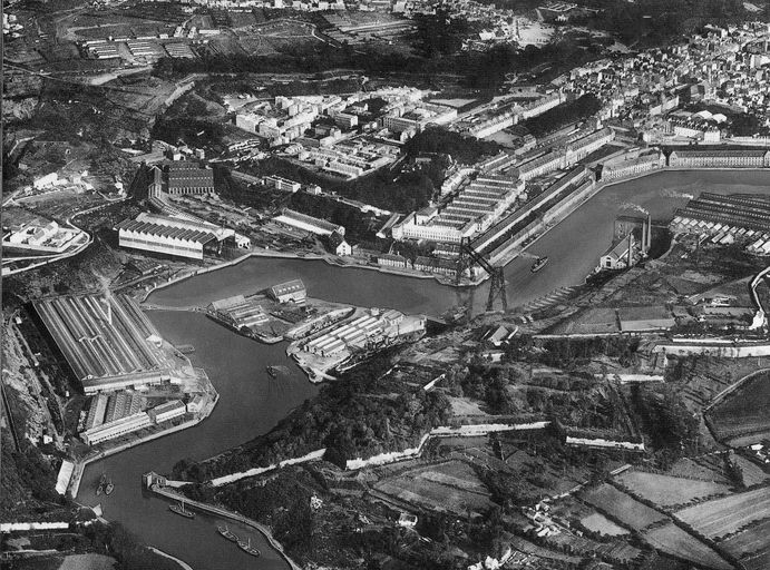Vue aérienne Nord-Sud de l'arsenal de Brest en 1926. Au centre de l'image : l'ouvrage à cornes de QuéliverzanImmatriculation