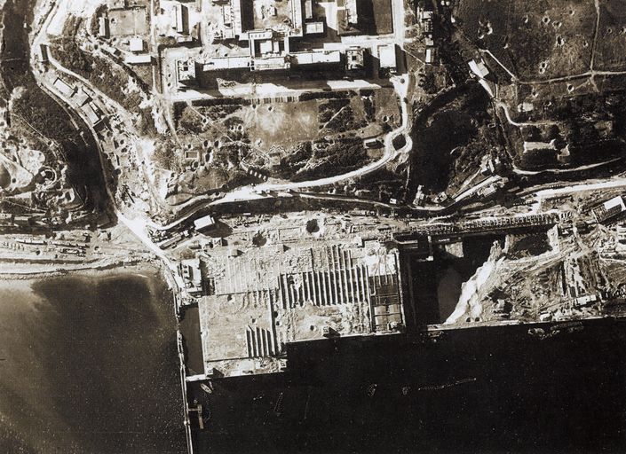 Vue aérienne verticale du Stützpunkt U-Bootbunker (base de sous-marins). A droite de la base de sous-marins : les fondations de l'extention estImmatriculation