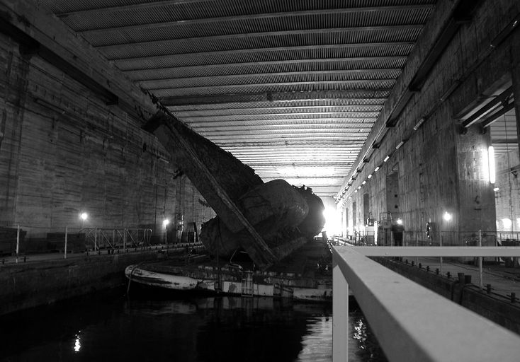 Vue intérieure de la base de sous-marins : alvéole à flot, bateau porte en attente sur une barge (2004)Immatriculation