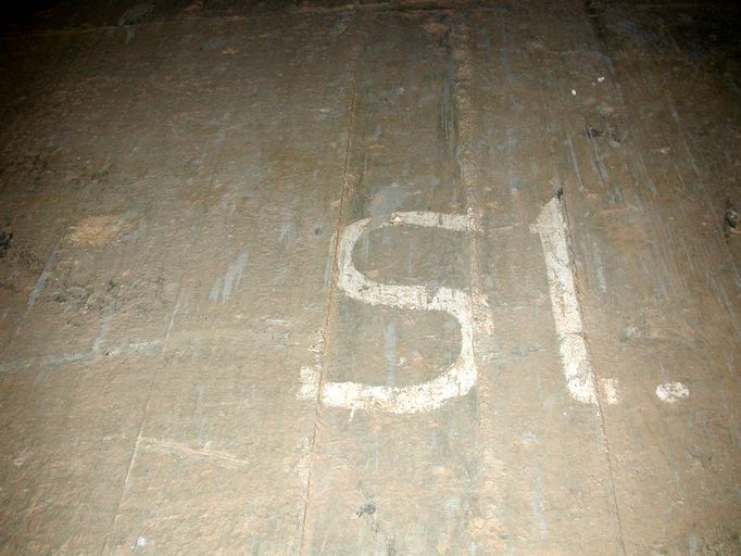 Détail de l'un des deux marquages situés au-dessus de l'entrée actuelle du bunker : "St." (couleur blanche)Immatriculation