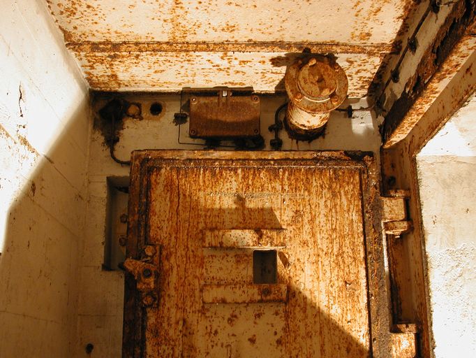 Poste d'observation/petite pièce latérale, détail du vantail supérieur de la porte blindée de type 434P01, boitier (électrique ?) et récepteur d'antenne (?)Immatriculation