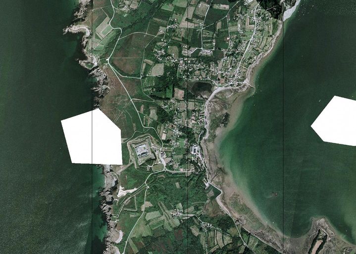 Vue aérienne des lignes de Quélern, en blanc : les terrains militaires, orthophotographie littorale, 2004Immatriculation
