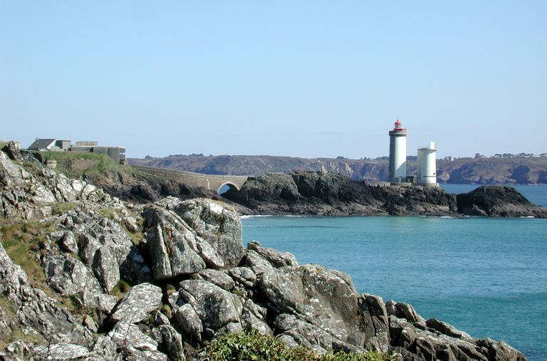Vue générale de la pointe du Petit Minou depuis la pointe du Grand Minou - Toulbroc'h (côté ouest) : fort, batteries, pont, phare et tour pour radômeImmatriculation