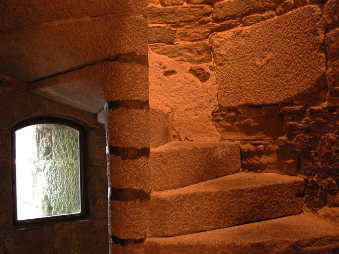 Vue de l'escalier à vis desservant les parties hautes et logé dans le saillant arrièreImmatriculation