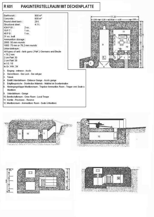 Typologie : abri de type H 601 pour canon avec chambre de troupe. Dessin Patrick Fleuridas, Belgian Bunkersite (http://www.bunkers.be)Immatriculation