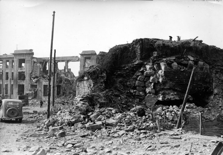 Vestiges de la porte de Landerneau après la bataille de Brest, fin 1944, en arrière-plan : la posteImmatriculation