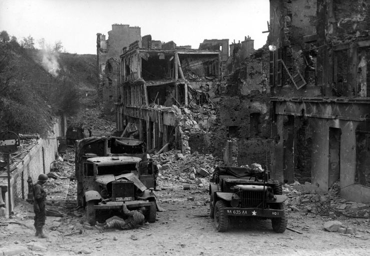 Vue générale de la rue Colbert, septembre 1944. Trois soldats américains inspectent un véhicule de transport abandonné au milieu de la chaussée. Leur jeep immatriculée 9A 635 AA (HQ 1) est garée à côtéImmatriculation