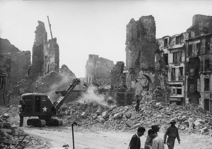 Vue de la démolition d'un immeuble avec arcade à l'aide d'un engin du génie américain, septembre 1944Immatriculation