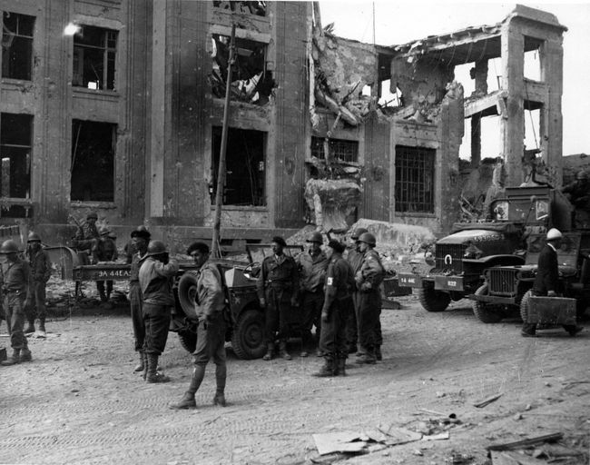 Vue de soldats américains autour d'une jeep garée devant la poste rue de Siam, septembre 1944Immatriculation
