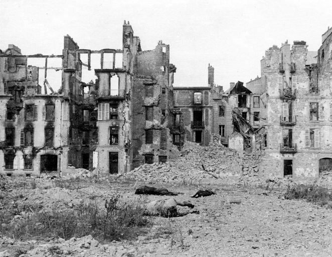 Vue de la Place du Génie : immeubles détruits, septembre 1944. Au premier-plan : trois chevaux morts (Au revers de la photographie : cachet du service photographique du journal Ouest-France)Immatriculation