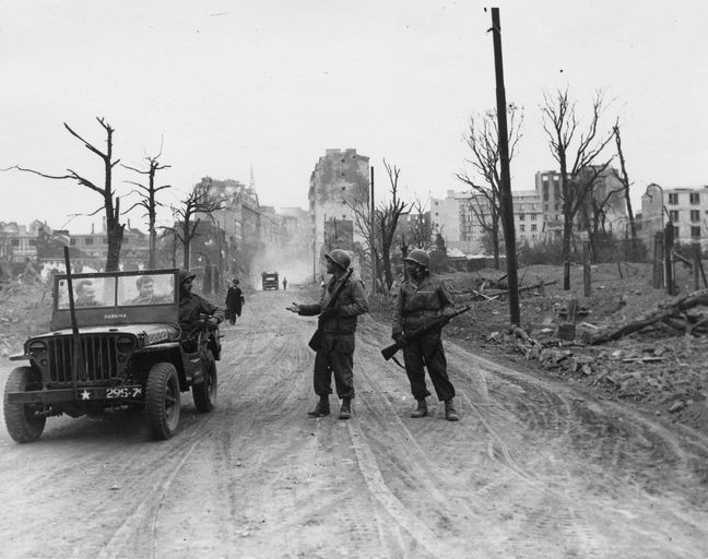Vue de la Place de la Liberté, au départ de la rue Jean-Jaurès : discussion entre deux soldats américains à pied et des soldats circulant en jeep, septembre 1944Immatriculation