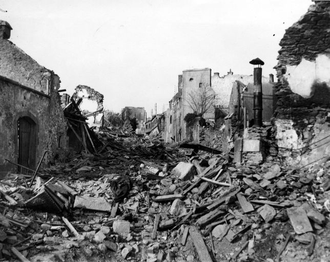 Vue de la rue de la Vierge : chaussée encombrée de débris des immeubles dévastés (Au revers de la photographie : cachet du service photographique du journal Ouest-France)Immatriculation