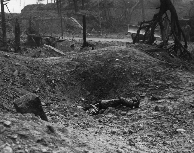 Vue de la Place Anatole-France : corps au milieu des décombres, septembre 1944 (Au revers de la photographie : cachet du service photographique du journal Ouest-France)Immatriculation