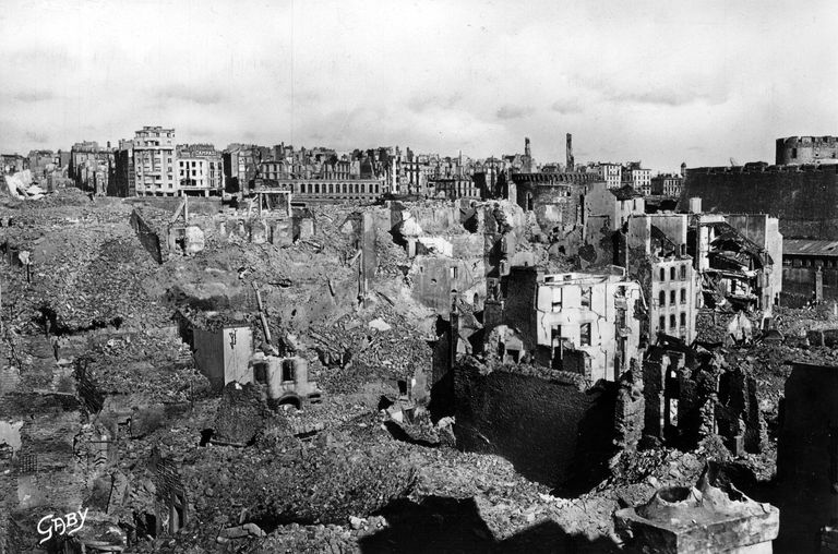 Vue générale de Brest depuis le quartier de Recouvrance, fin 1944, carte postale (Gaby). On distingue à droite la Tour Tanguy et le châteauImmatriculation