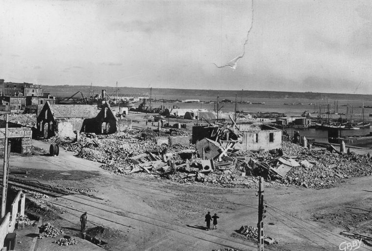 Vue générale du port de commerce, carte postale (Gaby). Au milieu des décombres, on distingue des bunkers aménagés sur les quaisImmatriculation