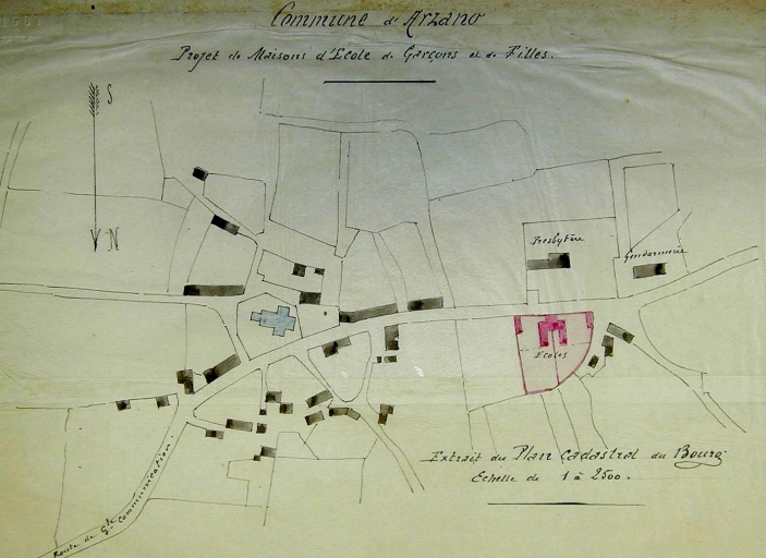 Plan-masse du bourg, 1880, par Joseph Bigot. En rouge, projet d'une école et mairie (A.E.Quimper, 8 L)Immatriculation