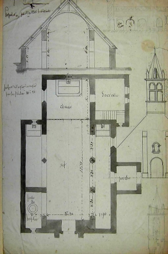 Locunolé, église paroissiale Saint-Guénolé : ancienne église. Plan au sol avant travaux, par Joseph Bigot, 1863 (A. E. Quimper, 8 L fonds Bigot), reproduction de 2004Immatriculation