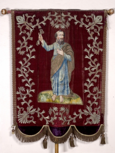 Bannière de procession paroissiale : Saint Pierre, Christ en croix,