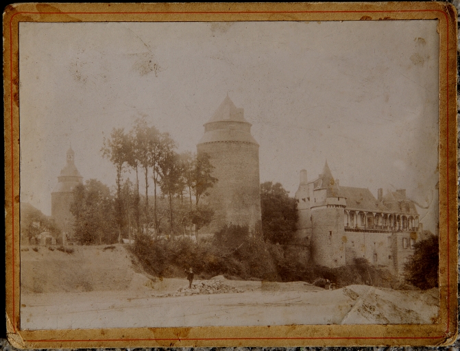 Le château de châteaugiron, travaux pour la ligne de tramway, vue prise du Bas Noyal, photo vers 1899.(A.P. Jean Duroudier)Immatriculation