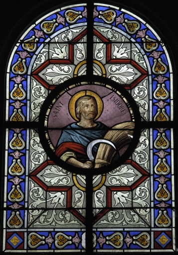 Ensemble de 6 verrières à personnages des baies 3, 4, 7, 8, 11, 12 : Notre-Dame de Lourdes, Sacré coeur ; Ange gardien, Saint Louis, Saint Isidore, Saint Julien,