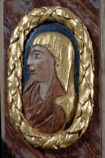 Détail du décor sculpté : buste de la ViergeImmatriculation