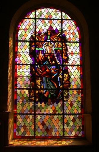 Ensemble de 4 verrières figurées : baies 1, 2, 9, 10 : Couronnement de la Vierge, Christ, Tétramorphe, Annonciation et Nativité,