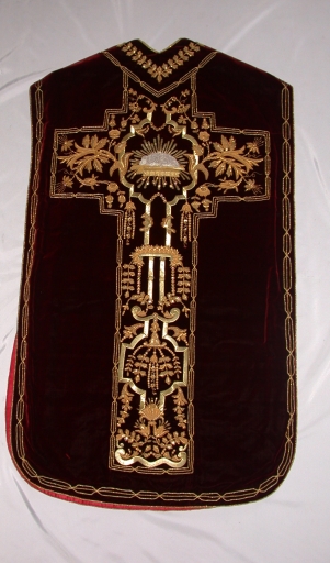 Ornement rouge : chasuble, bourse de corporal, étole, manipule, voile de calice, pale et voile de pupitre d'autel,
