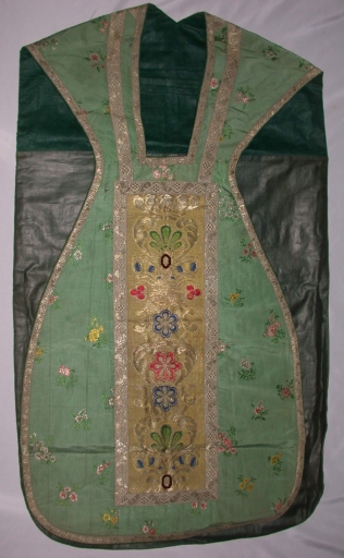 Ornement vert 1 : chasuble, bourse de corporal, étole, manipule, voile de calice, étole pastorale,