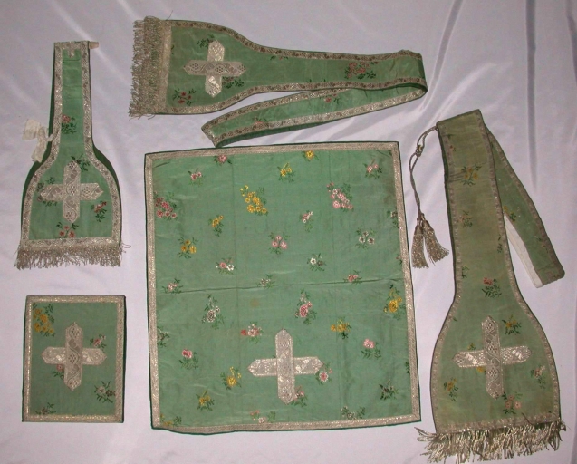Ornement vert 1 : chasuble, bourse de corporal, étole, manipule, voile de calice, étole pastorale,