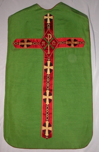 Ornement vert 3 : chasuble, bourse de corporal, étole, manipule, voile de calice,