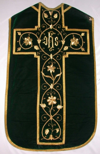 Ornement vert : chasuble, bourse de corporal, étole, manipule, voile de calice,