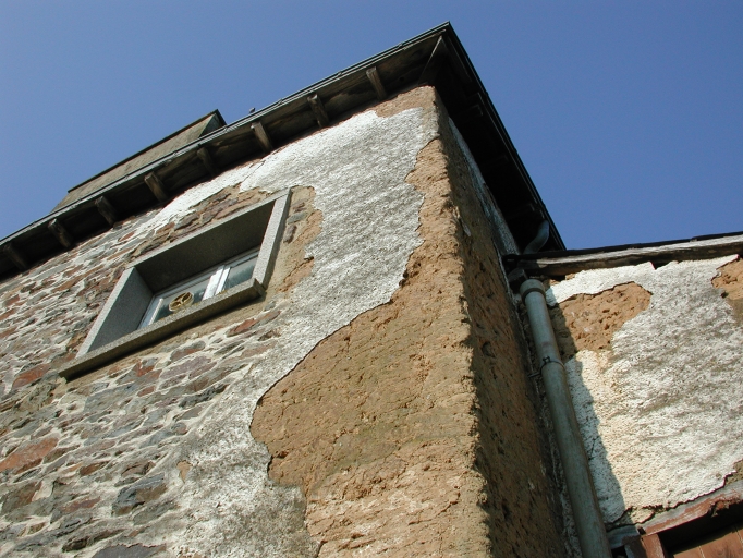 Détail des matériaux de construction : gros-œuvre en moellon de schiste et terre recouverte d'un enduit de couleur blanchâtreImmatriculation