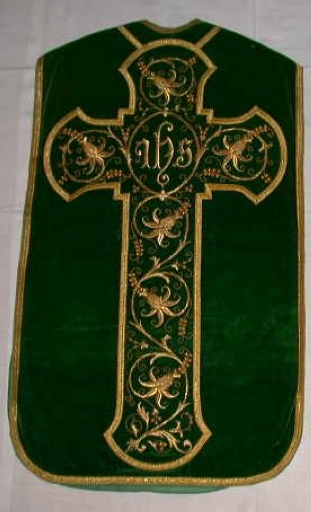 Ornement vert : chasuble, bourse de corporal, étole, voile de calice, chape,