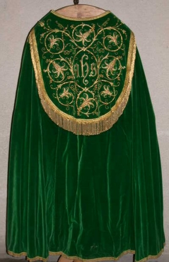 Ornement vert : chasuble, bourse de corporal, étole, voile de calice, chape,