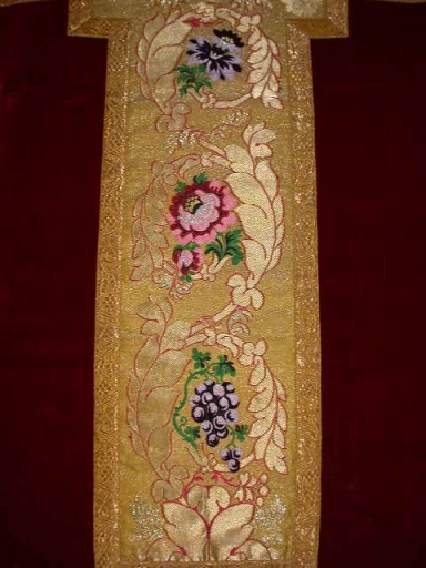 Ornement rouge : chasuble, bourse de corporal, étole, voile de calice,