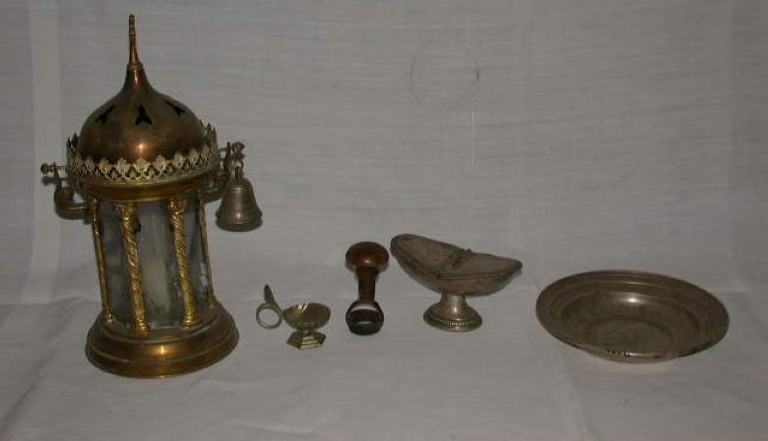 Lanterne du viatique, coquille de baptême, découpoir à hosties, navette à encens, plat de quêteImmatriculation